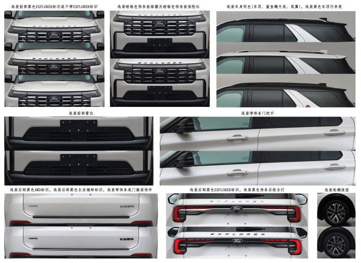 值得一提的是,新款外观探险者支持丰富的个性化选装配置,包括车头/车尾字母标识、格栅饰条、车顶、车顶行李架、尾翼等都可选黑化或银色套件,门把手也能加装镀铬饰条。